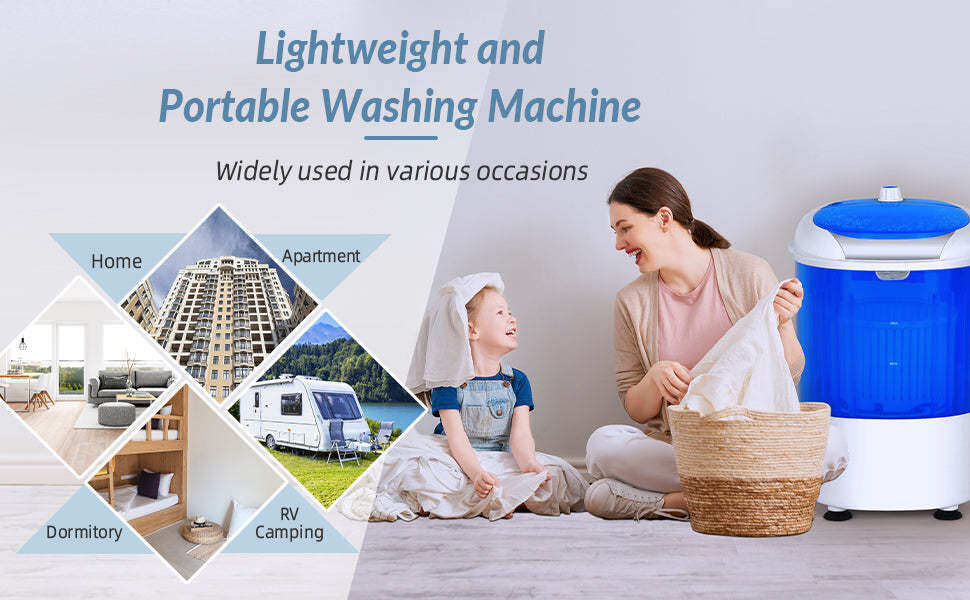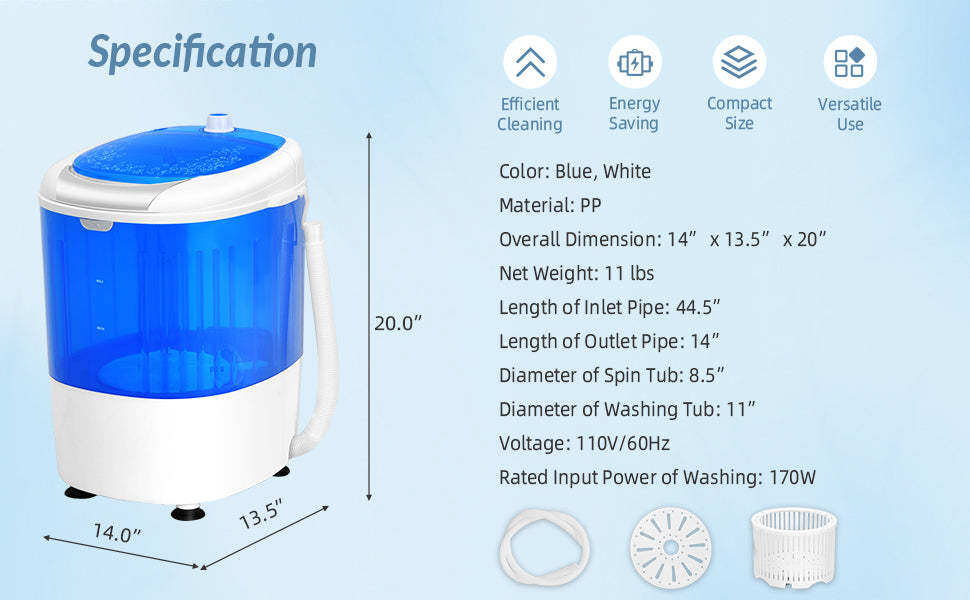 • Compact & Portable Size: This mini washing machine comes with a compact and portable size of 14” x 13.5” x 20”, which can be an ideal choice for limited space. What's more, the weight of this washer is only 11 lbs, making it easier to move and use in an apartment, dormitory RV, etc.