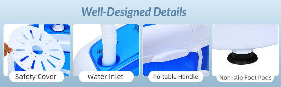 • Attentive Design: The clear washer lid allows you to check the condition of the washing process. This washing machine will be prevented from rusting in a wet environment because of durable plastic material. With non-slip foot pads, our washing machine is stable enough on uneven ground.