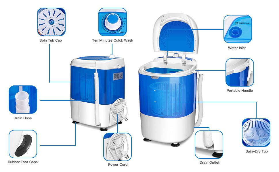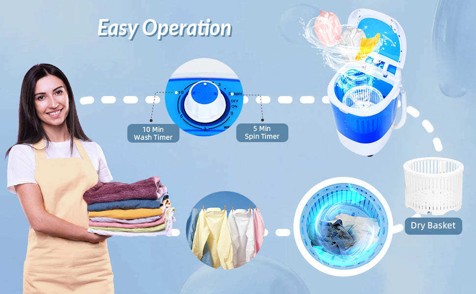 • Easy Operation & Time Control: Designed with a rotating control timer, this washer and dryer can be set for 10 minutes of washing time and 5 minutes of spinning time. This laundry washing machine allows you to easily put in your dirty clothes, then fill it with water and set the time control.