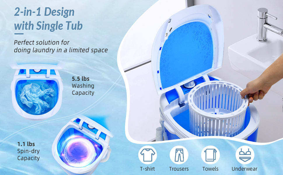 • Sufficient Washing Capacity: Featuring a 5.5-pound washer capacity, this mini yet powerful washer can hold multiple loads of laundry, socks, underwear, etc at one time. A 170W powerful motor and 1.1 lbs spinning dryer will not only meet your daily needs but also save energy.