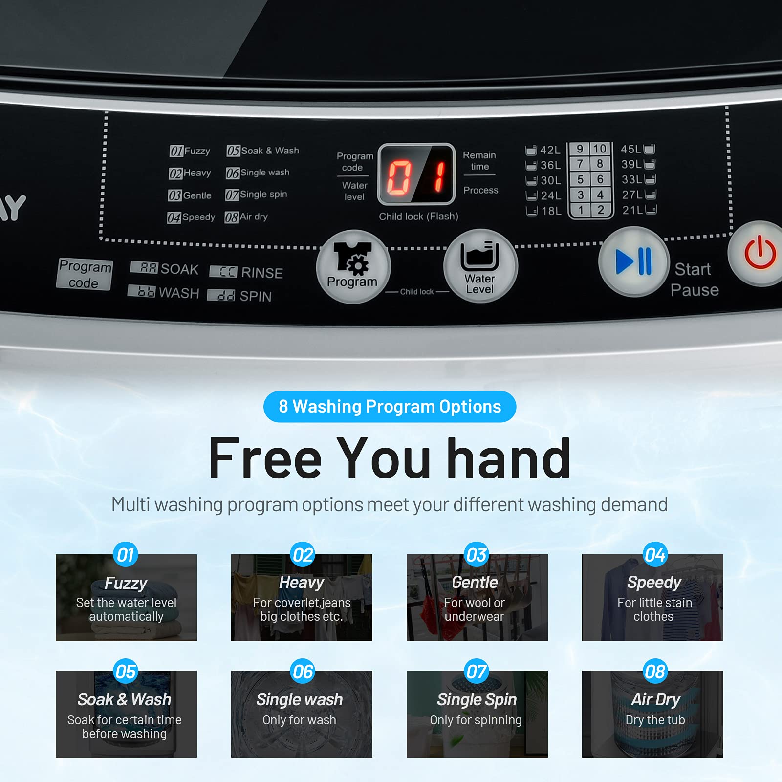 - [Easy Operation with LED Display]The washing machine comes with 8 washing programs and 10 water levels on the control panel for easy operation. For example, heavy mode takes 57 minutes to wash jeans and big clothes while gentle mode for washing wool requires 26 minutes. As for child lock, you can press the two buttons simultaneously to activate the safety lock.