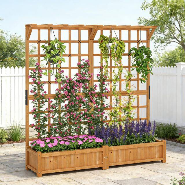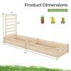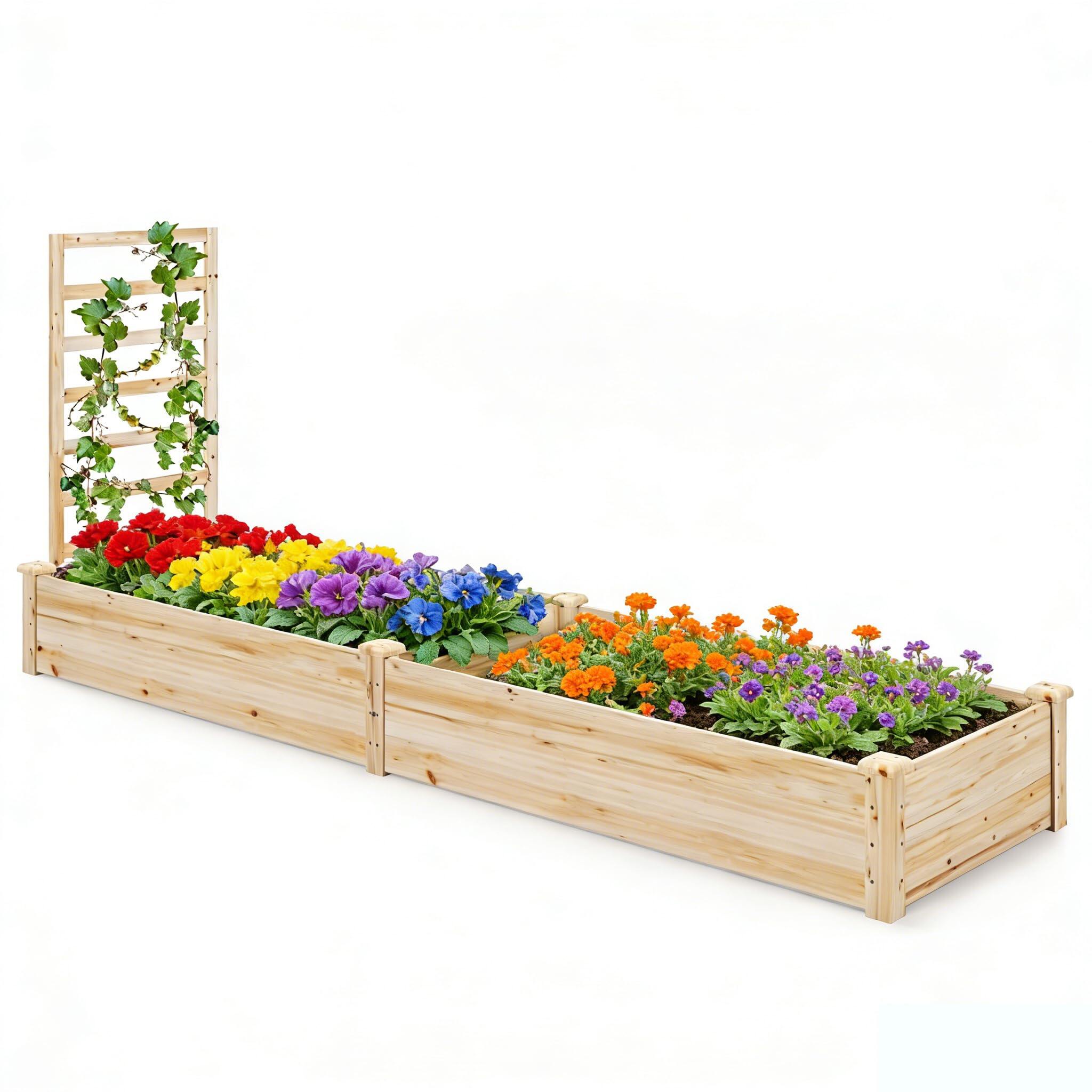 Effortlessly grow a variety of plants with the COSTWAY Raised Garden Bed — thoughtfully designed with a spacious dual-box planter and a sturdy trellis for climbing vines and decorative accents. Its open-ended base supports excellent drainage and soil health, helping your plants thrive. Crafted from durable, natural fir wood that resists warping and cracking, this planter offers long-term outdoor reliability. The untreated wood surface invites your creative touch through painting or staining, perfectly tailoring this garden bed to your outdoor space. With reinforced corners and thick wood panels, plus easy, tool-free assembly using slotted legs, it's the ideal elevated planter for patios, gardens, greenhouses, and beyond. Grow beautiful flowers, fresh herbs, vegetables, and fruits—all in one convenient, stylish setup.