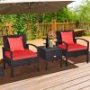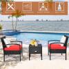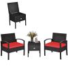 This outdoor chair set is crafted of hand-woven rattan and sturdy steel frame, which is durable enough to withstand moderate change of weather and can be used for long time. Its thick sponge padded cushions and ergonomic are comfortable for you to totally relax yourself. Cushion covers with smooth zipper can be removed for cleaning. Plus, the coffee table is designed with storage space to help storing items. This patio sofa set will let you enjoy fun with family and friends while also taking in the view and fresh air. It is a good choice for patio, porch, backyard, balcony, poolside, garden and other suitable space in your home.