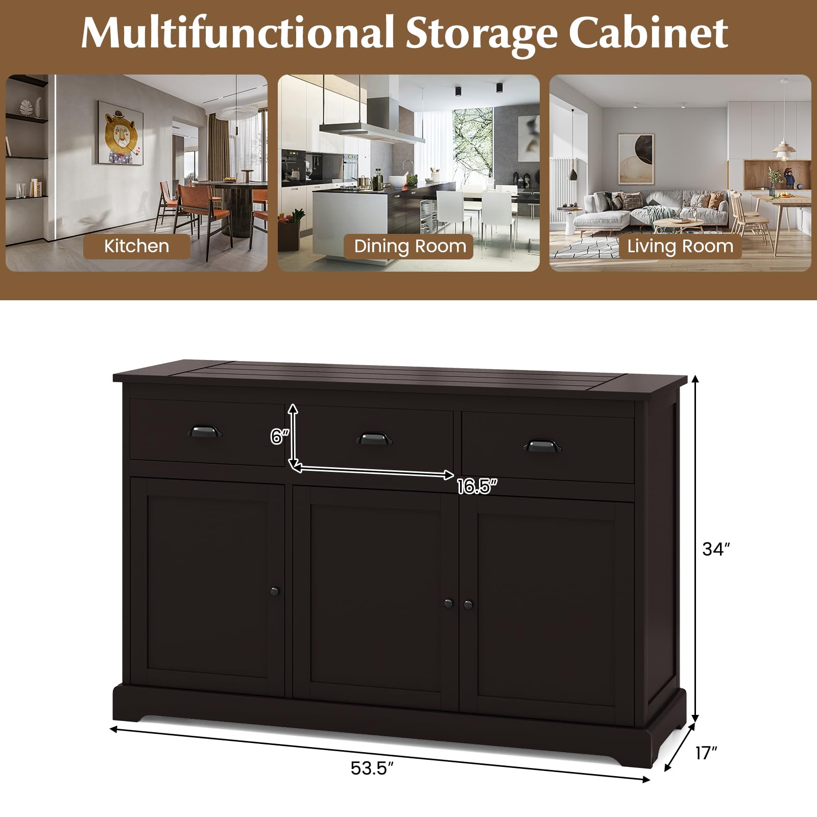 Our stylish sideboard buffet combines the functionality of a countertop, cabinets and drawers, making it a versatile addition to any room. The sturdy construction and anti-tipping design are both durable and safe in everyday use. Multi-tier storage area provides ample space for storing a variety of items to help keep your room neat and tidy. Adjustable shelf design allows for customizable storage options. Its minimalist design complements a variety of home decor styles and simplifies your daily organization. This kitchen sideboard is versatile and practical, suitable for use in the bedroom as a storage cabinet, in the kitchen as a buffet or sideboard, and in the entry as a console table.
