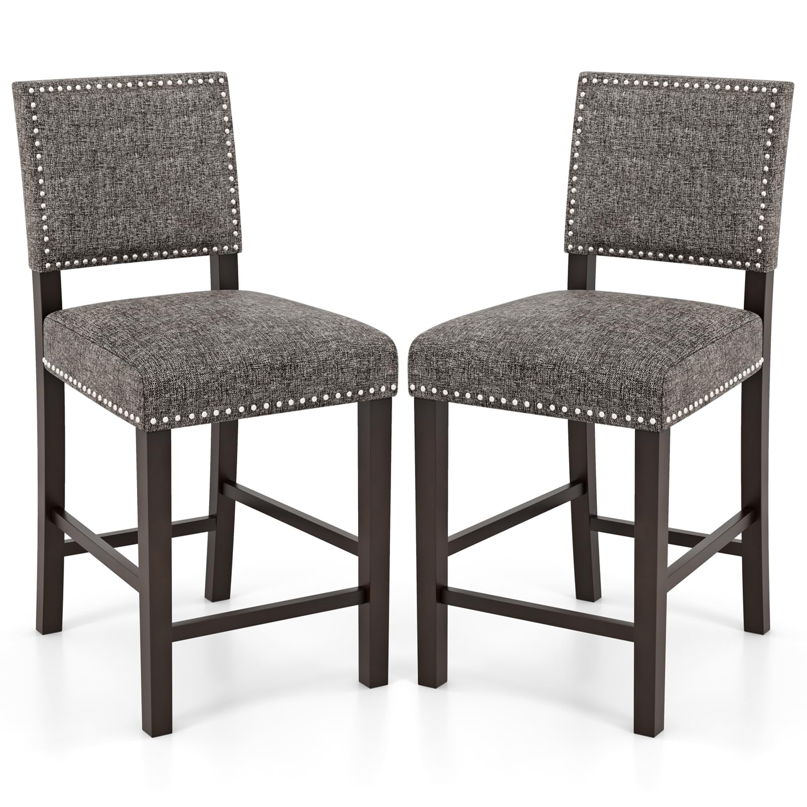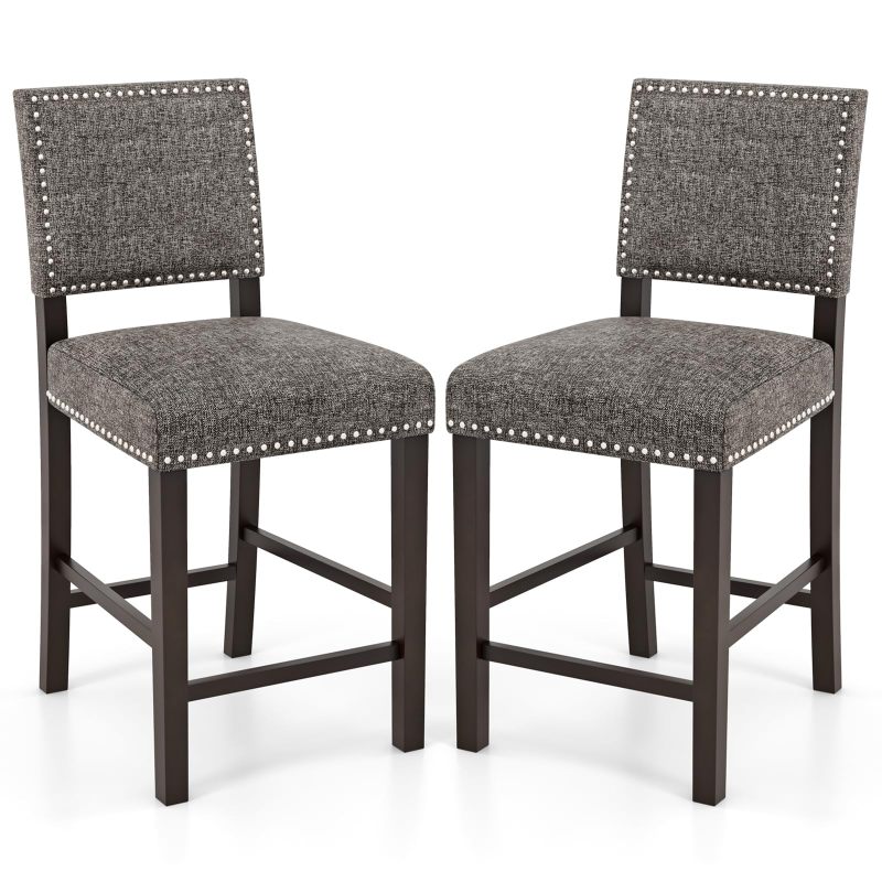 Step into comfort and style with our meticulously crafted upholstered bar stools. Featuring high-density sponge padded seats wrapped in breathable linen fabric, these stools provide a snug, supportive seating experience that is great for lengthy sitting sessions. Whether you're catching up on work or enjoying a meal, the comfort of these bar stools makes them a reliable choice. Designed with your relaxation in mind, each bar stool includes an ergonomic backrest and an integrated footrest. Built with solid rubber wood legs, these robust counter height bar stools are made to support up to 330 lbs / 150 kg. The stylish nailhead trim adds a classic touch to the chic linen upholstery. These stools easily become a stylish focal point in your kitchen, dining room, or cafe.