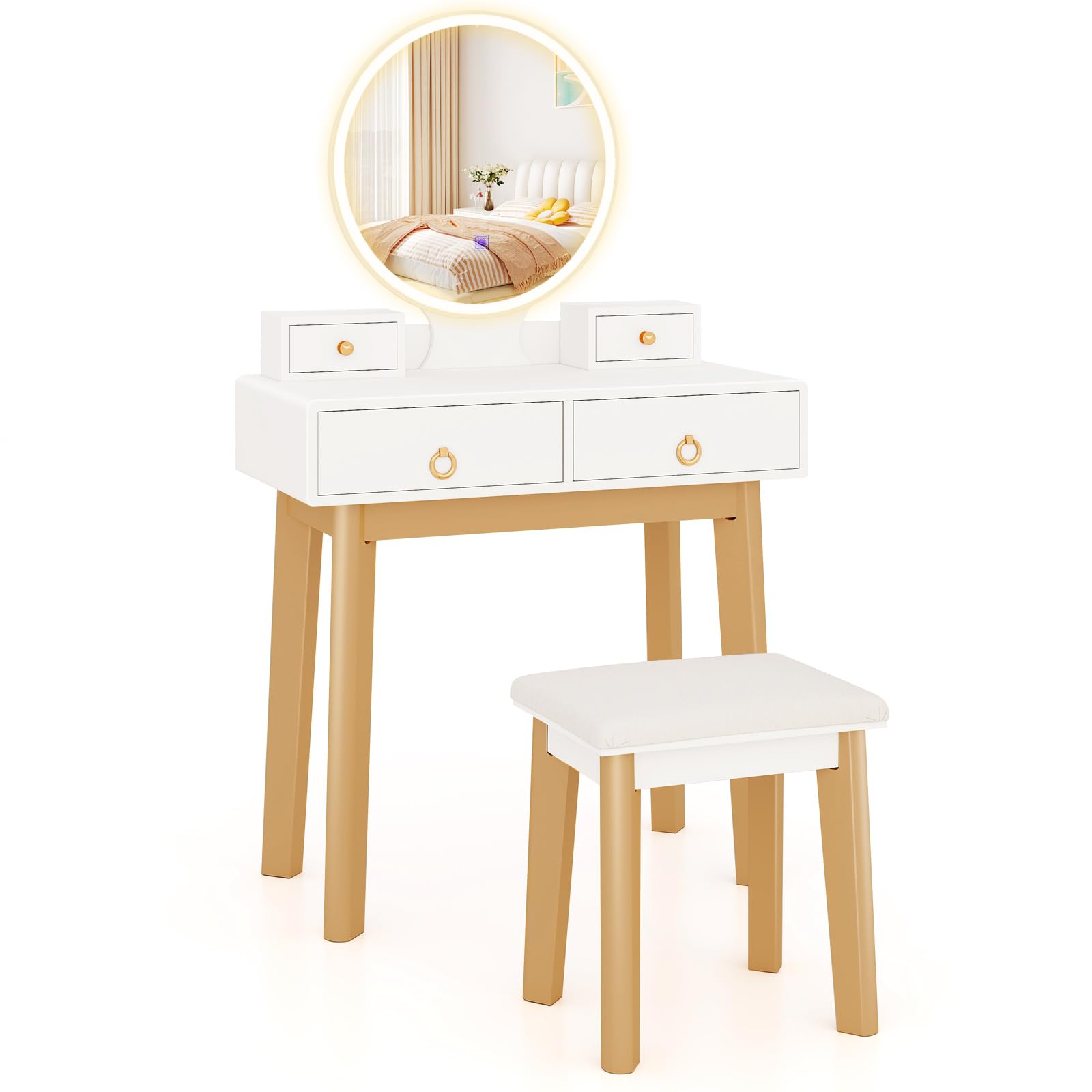 Start your morning routine with this gorgeous and charming vanity table set! Our elegant yet practical dressing table is equipped with LED lighted mirror and cushioned stool. Lustrous gold painted solid wood frame matches perfectly with elegant wooden board, making it a perfect addition to your bedroom. The large mirror with 3-color adjustable LED lights makes your makeup more convenient even in the dark. And the thick and soft sponge cushion with flannel cover will make you sit more comfortably without fatigue.