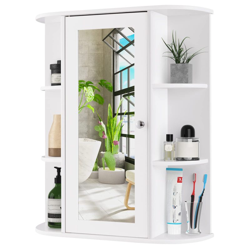 Unlike other cabinets, our bathroom cabinet comes with a large mirror, which offers a clear reflection to help check your makeup look. Featuring 6 open side racks and 4-tier interior shelf, the wall cabinet provides enough space to store and organize your essentials, such as towels, tissue boxes, toothbrushes, shampoo, ornaments, etc. In addition, 6-level adjustable inner shelf ensures flexible storage for items with different sizes. This hanging cabinet is made of thick MDF with delicate lacquer finish, which is waterproof and resistant to humidity for long-term use in the bathroom. Combining minimalist design with modern appeal, our wall mirror cabinet can be easily coordinated with any decor style. Add this timeless organizer to your home today!