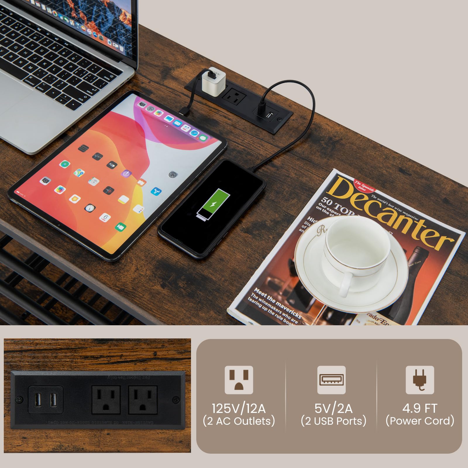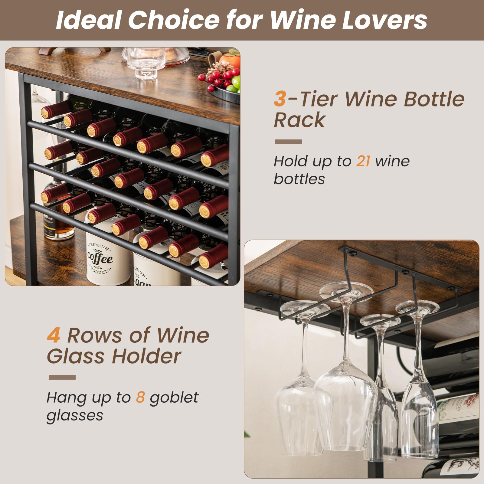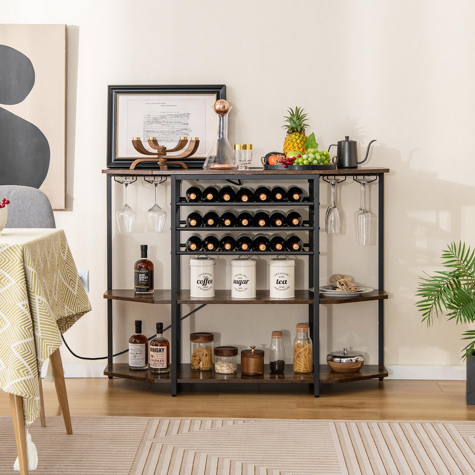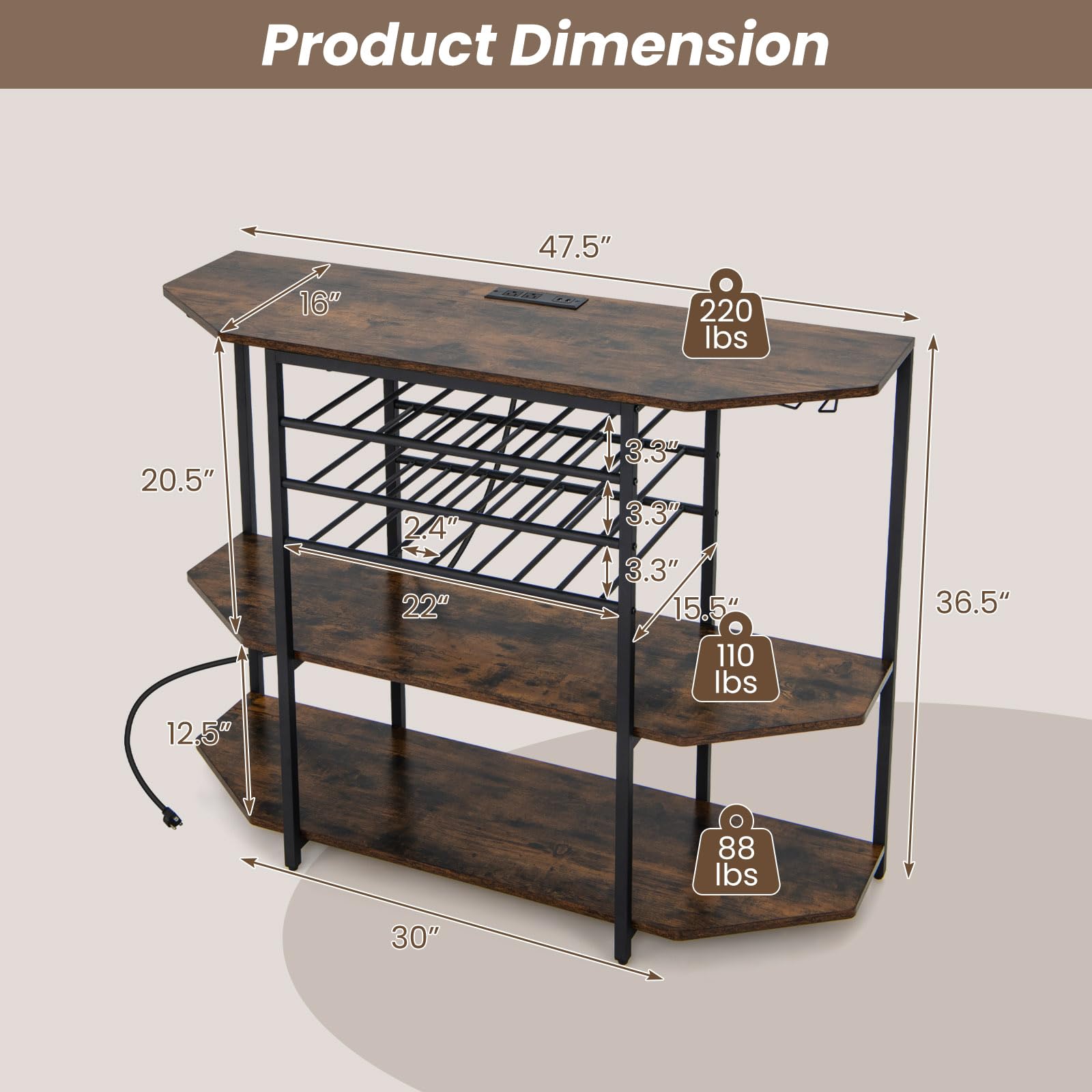 Create a focal point with this contemporary wine rack table by displaying wine and a coffee maker. With a built-in charging station, you can simultaneously charge multiple electric devices. Combining wine bottle rack, glasses holder and open storage shelves in one, the freestanding bar cabinet will meet your needs for storing wine bottles, glasses and other kitchen supplies. Worried about its stability? No need! The adjustable foot pads will keep it stable on uneven floors. In addition, the anti-tipping device will prevent it from tip-overs. Besides using it as a wine rack, it also works amazingly as a sideboard, coffee bar cabinet and more.