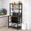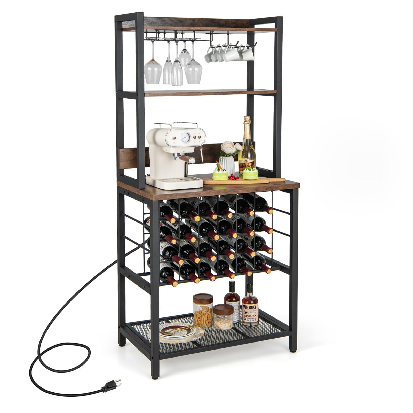 The built-in charging station of wine bar cabinet allows you to simultaneously charge multiple electric devices. With wine bottle rack, glass holder and cup holder, the wine bar cabinet can stably hold 24 bottles of wine, 9 glasses and 6 cups. What’s more, 4-tier storage shelf can meet your storage needs for other kitchen supplies. Worried about it wobbles? No need! The adjustable foot pads and anti-tipping device will keep it stable even on uneven floors. This freestanding wine rack table can be placed in any corner of your home, all for your maximum convenience.