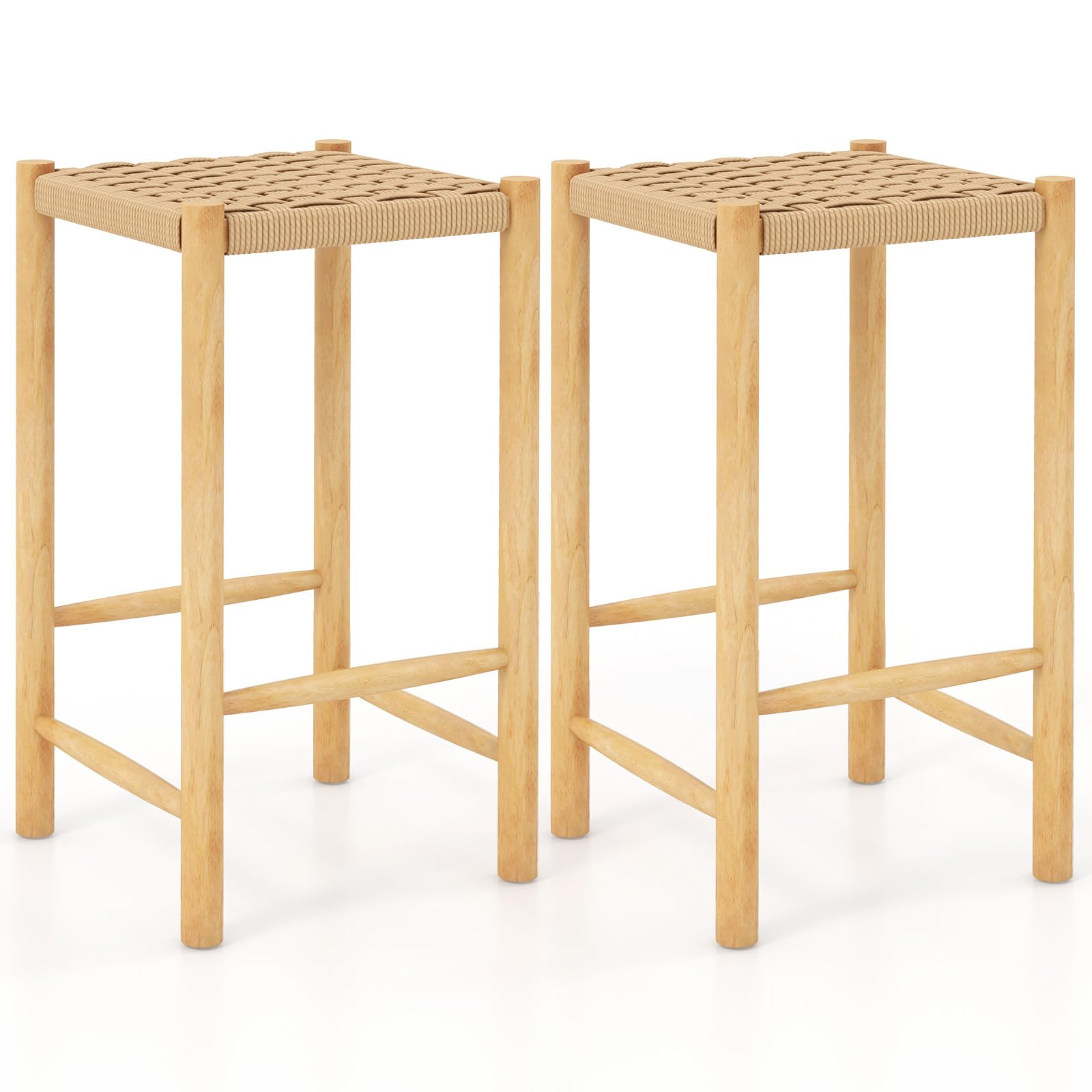 Enjoy relaxation with this exquisite set of 2/4 counter stools, which are crafted with robust rubber wood frame to ensure unrivaled stability and long-term durability. Also, the impeccable wood surface adds a touch of refinement with its seamless finish and natural allure. Plus, the meticulously woven seat not only enhances comfort but also adds a touch of sophistication, making these dining wood stools a captivating focal point in any setting. Boasting versatility and charm, this elegant saddle stool set effortlessly transitions between indoor and outdoor settings, making it an ideal choice for kitchens, dining rooms, balconies, and beyond. With built-to-last material and rustic yet alluring aesthetic, these stools are sure to elevate any space they grace.