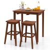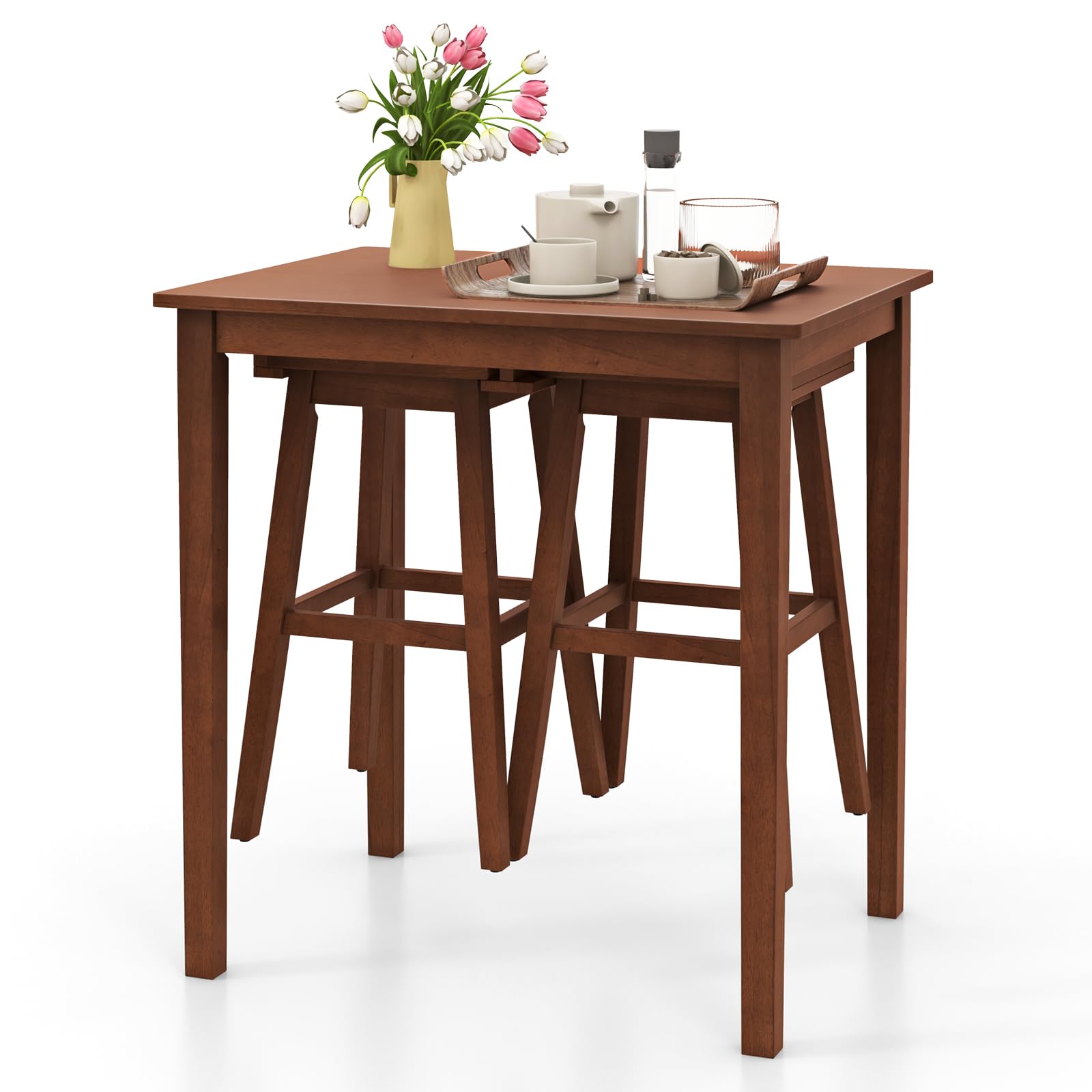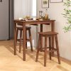 Featuring a wooden table and 2 saddle stools, this elegant bar table set is perfect for cozy apartments or compact kitchens. The space-saving design allows the stools to be hung beneath the table when not in use, maximizing your area. Built to last, the solid rubber wood frame offers reliable support and durability, with reinforced table corners for added stability. The wide MDF tabletop with a wood veneer finish offers ample space for dining, entertaining, or working, combining durability with aesthetics. The 2 solid wood stools offer superior comfort with their curved seats and sturdy footrests, making meals and gatherings more enjoyable. This versatile dining set adds a touch of sophistication to your breakfast nook, kitchen, or living room.