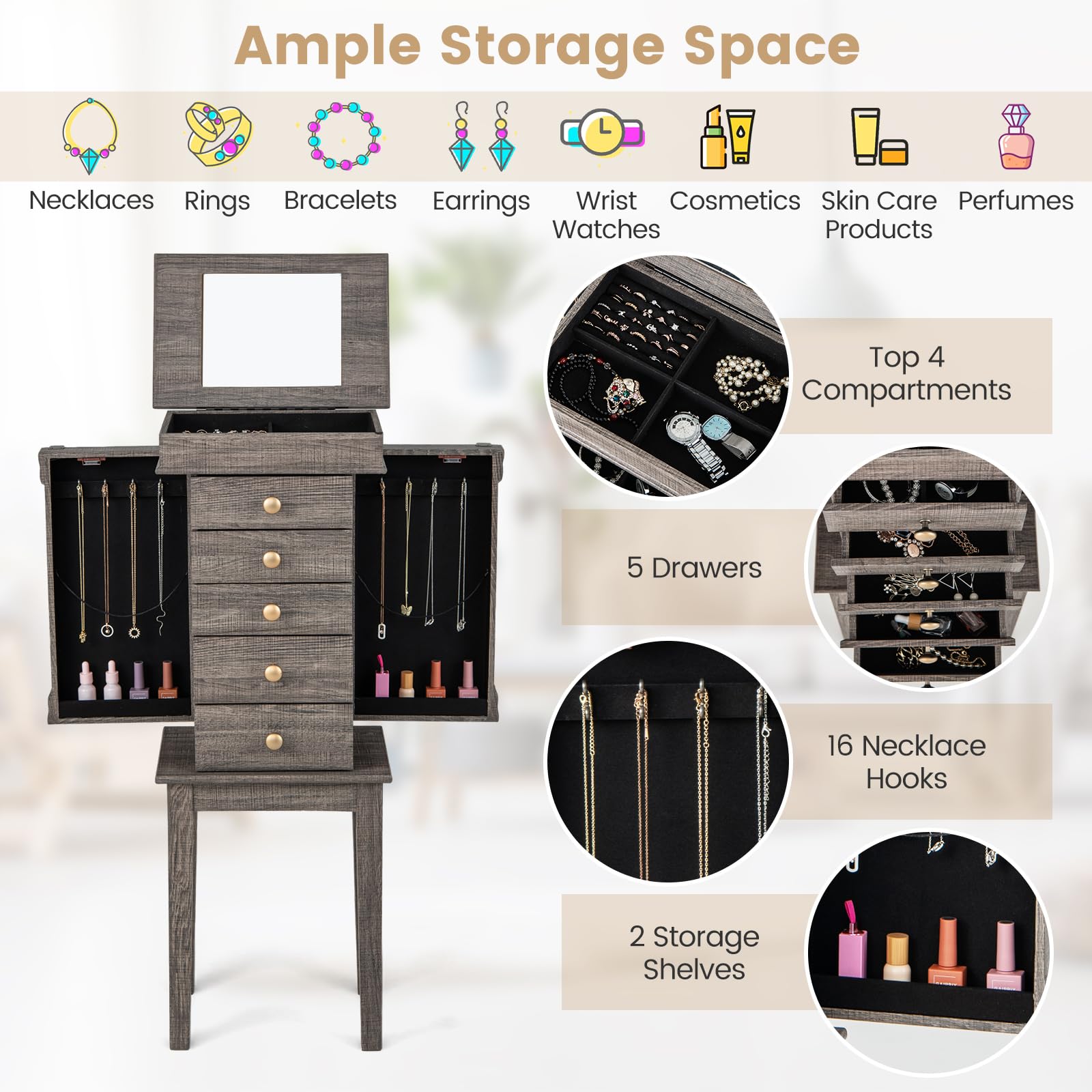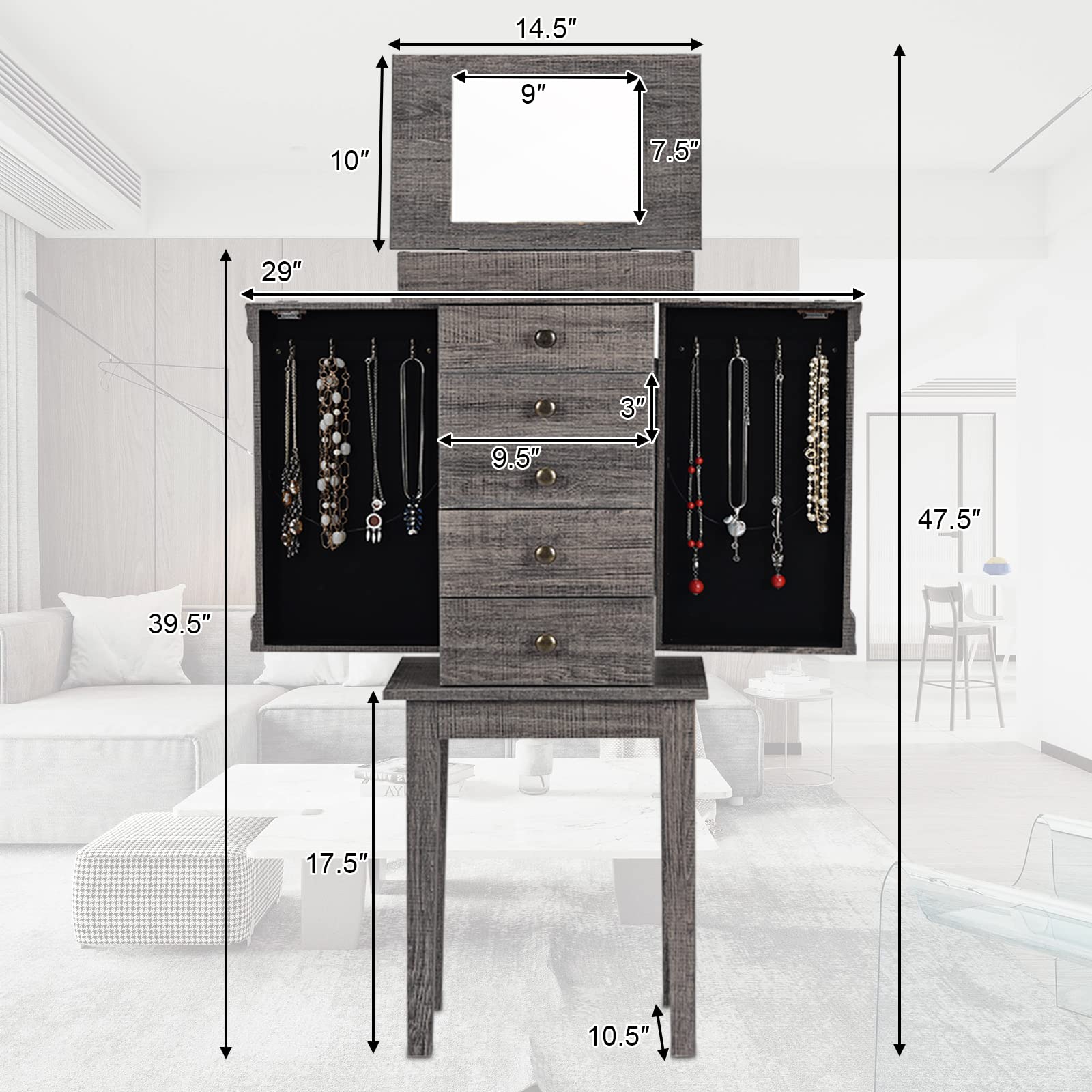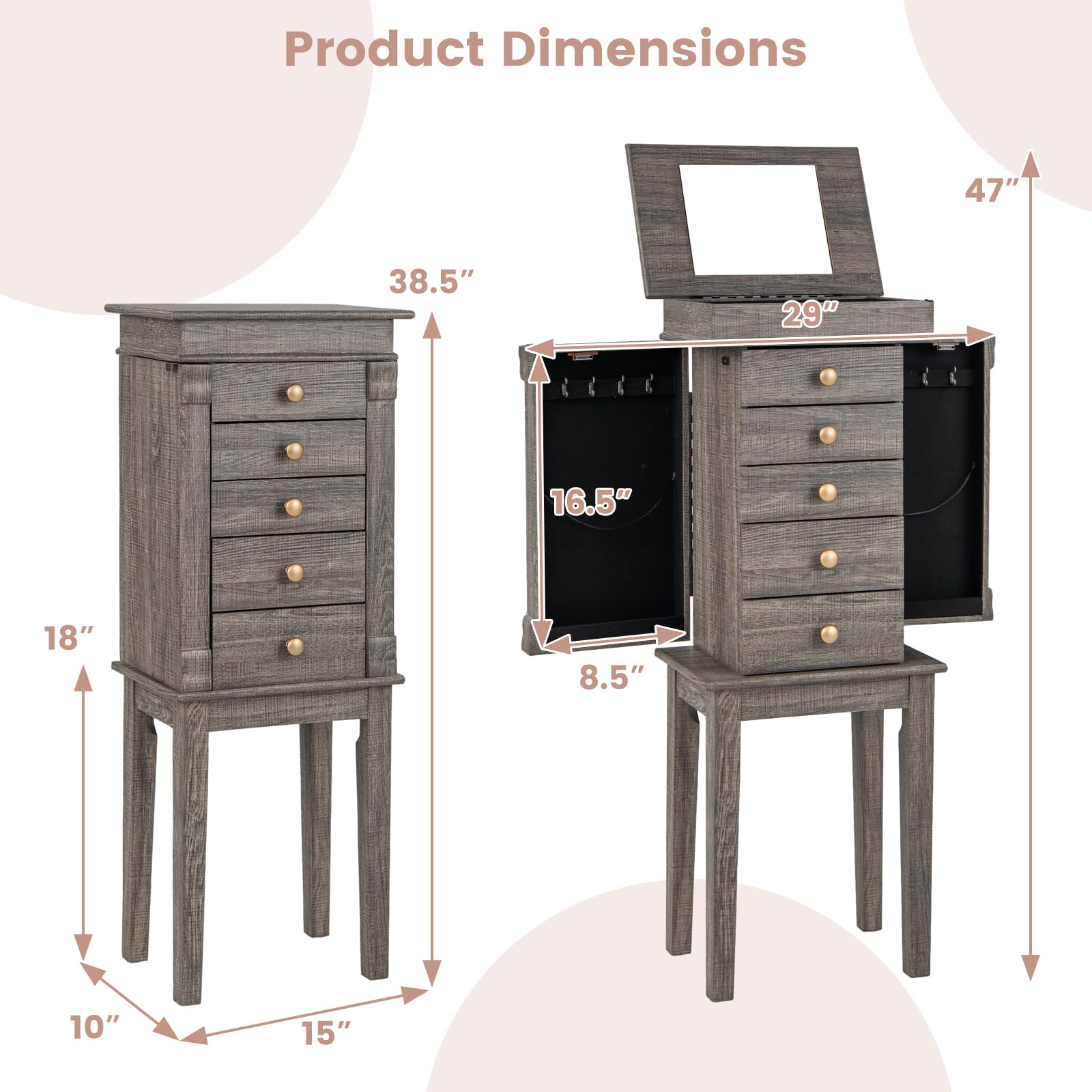 Featuring 5 drawers, 8 hooks in 2 doors and 4 top storage compartments, the jewelry armoire helps you to organize your earrings, accessories, cosmetics, necklaces, rings, bracelets and watches. Besides, it’s also designed with an embedded mirror to try on your jewelry. To better protect your jewelry, we equip it with soft lining to avoid scratches. Stable wood legs and anti-toppling device keep it durable and sturdy. High feet design helps you to conveniently clean the floor area. In addition, simple structure and easy-to-understand instruction ensure easy assembly.
