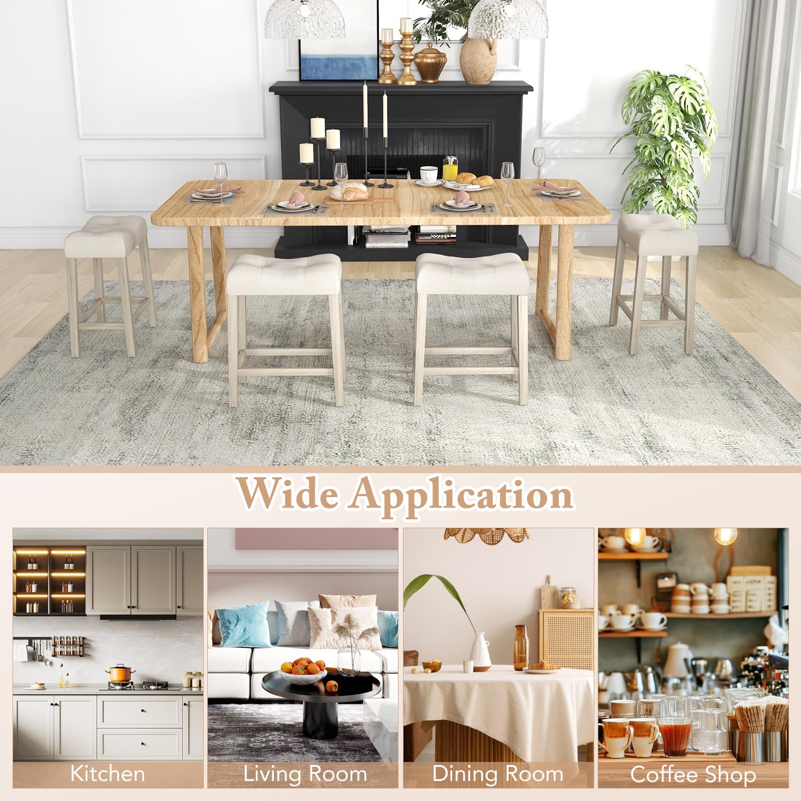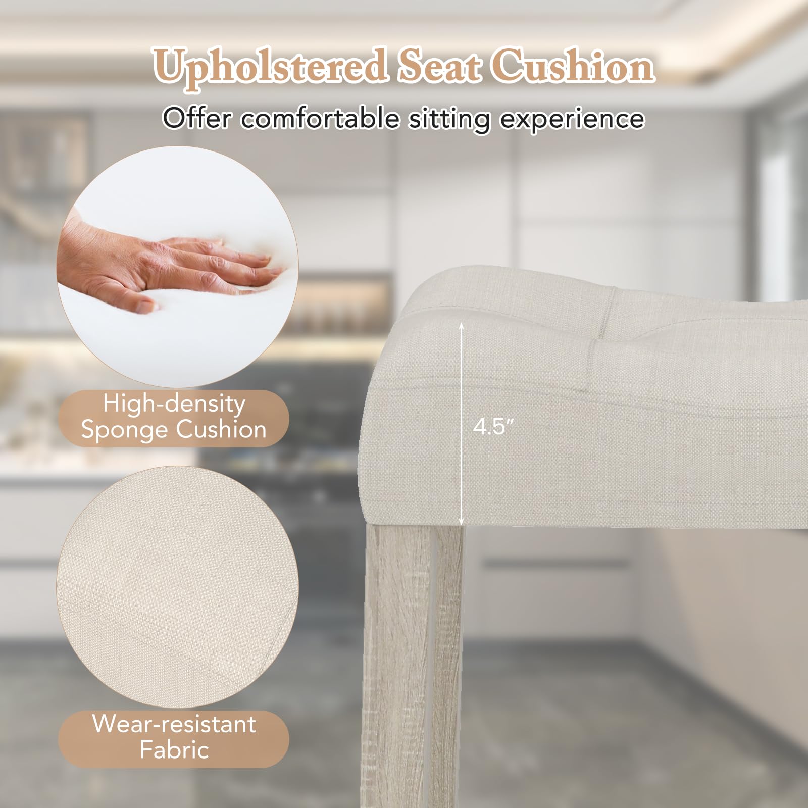 Our bar stool features a 4.5" thick high-density sponge cushion, providing a comfortable seating experience. With a premium rubber wood frame, these stools offer durability and stability, supporting up to 330 lbs. Their compact size allows for convenient storage under tables, making them ideal for various settings like the living room, dining room, kitchen, or bar. Additionally, the curved seat surfaces, elegant tufted designs, and comfortable footrests ensure a cozy seating experience, while the non-slip pads on the rubber wood legs add to the overall stability. Assembly is straightforward, and with dimensions suitable for counter heights between 35" to 39", these stools are a perfect addition to your home for both functionality and aesthetic appeal.