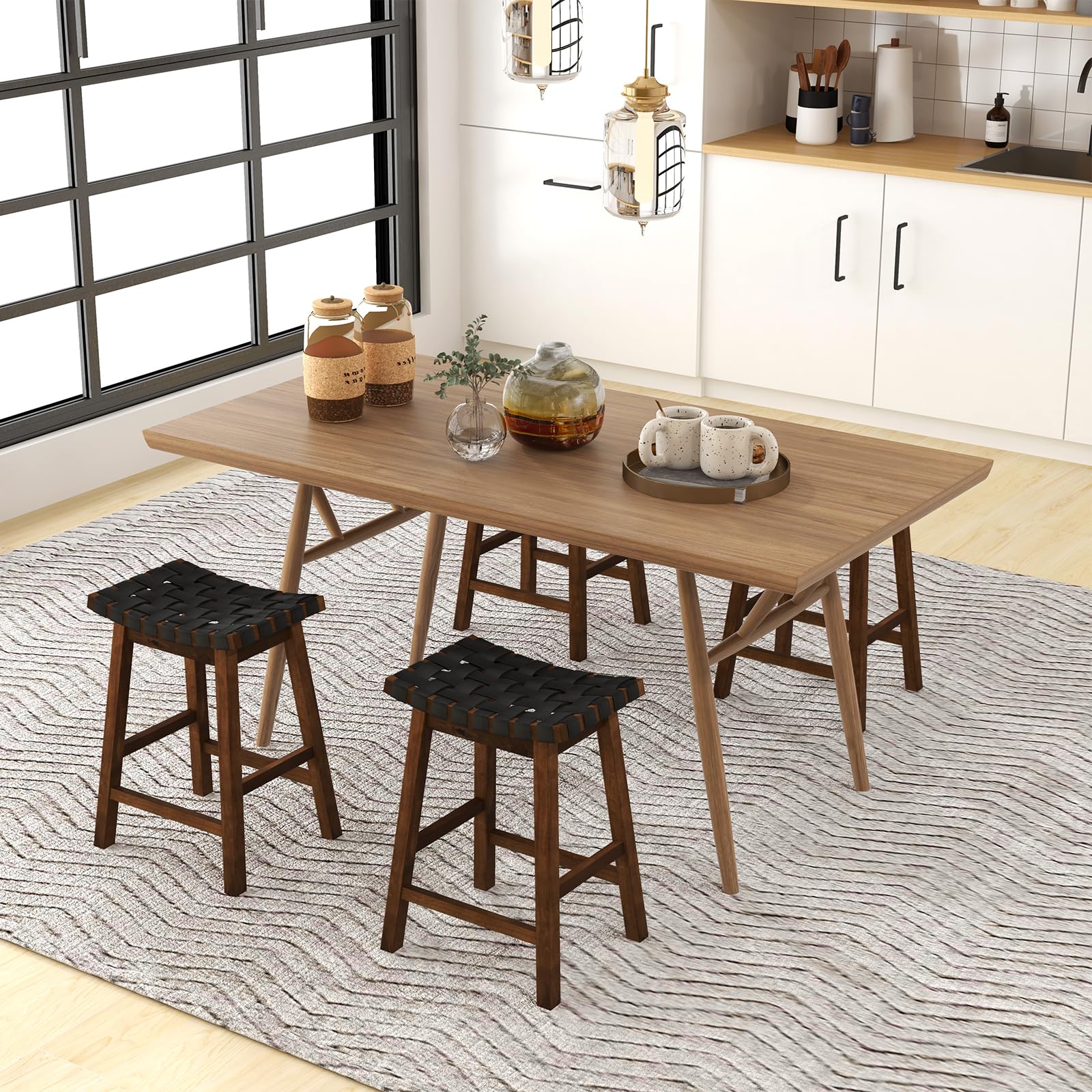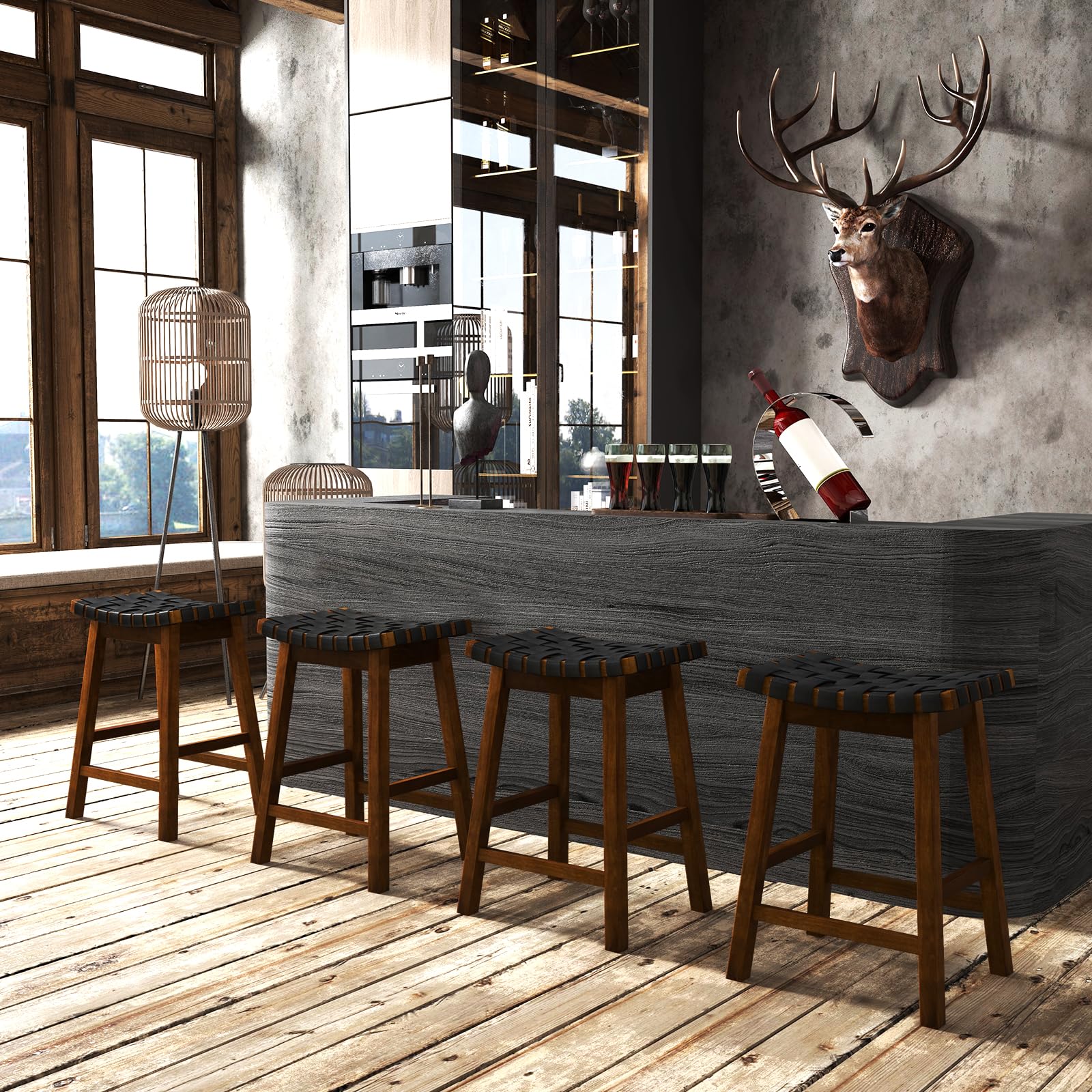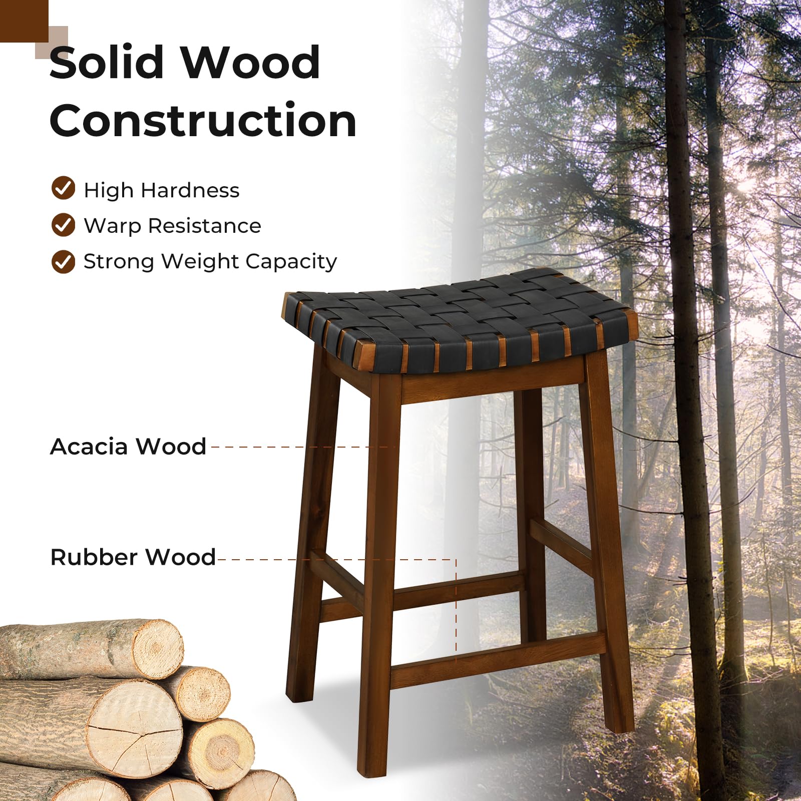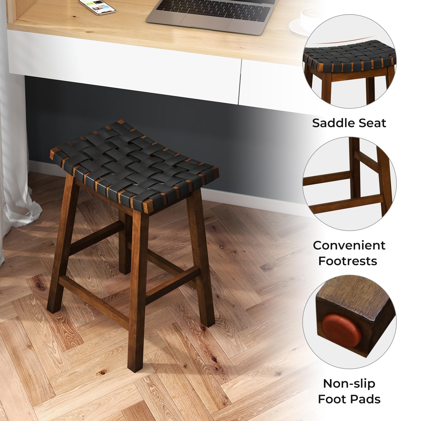 This saddle barstool set is a sleek and modern addition to any space. With a contemporary design, these backless saddle stools feature the faux PU leather woven seat for added style. The 25.5-inch height is perfect for standard kitchen counters or islands, providing a comfortable seating experience. Constructed with durable materials, including a sturdy wooden frame, these stools offer stability and support for everyday use. The convenient footrest adds comfort, while the versatile design makes these stools suitable for various settings, such as kitchen counters, home bars, or coffee shops.
