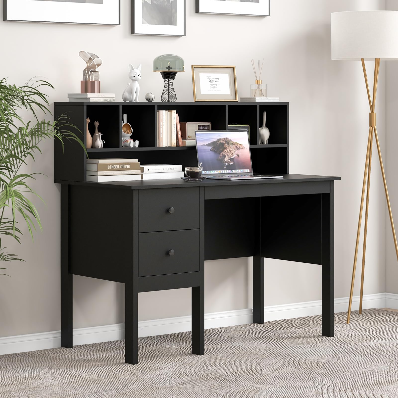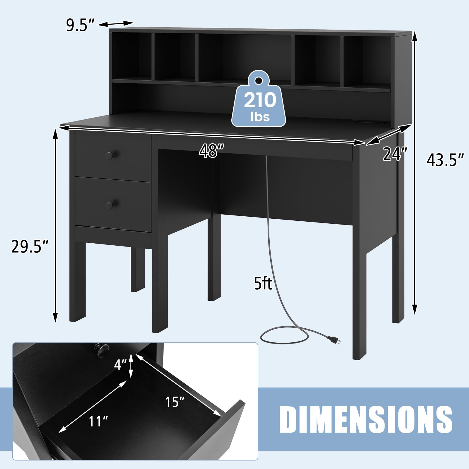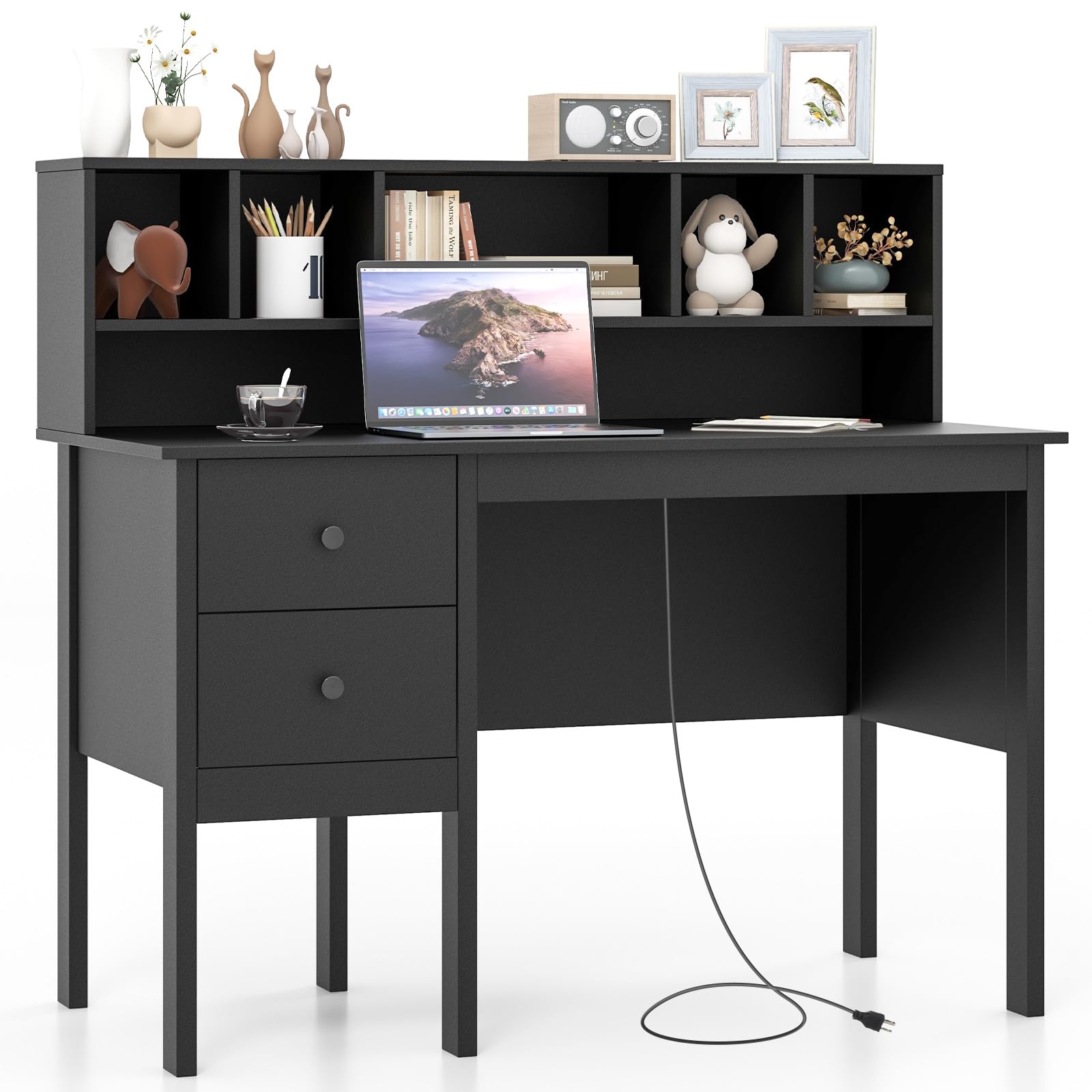 Writing Desk with USB Charging Ports & Power Outlets 48" Computer Desk with Drawers & 5-Cubby Hutch